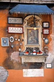 “A shelf is built into the back wall, a picture of Mary, candles and flowers that come and go as it is tended by locals, prayers on paper on the shelf, photos of people on the shelf… Le Celle has a real pedigree, and I preferred the rustic honesty of the santuaria. The poem was left behind a red candle (already there) among other pieces of paper, amid vases of droopy or plastic flowers.